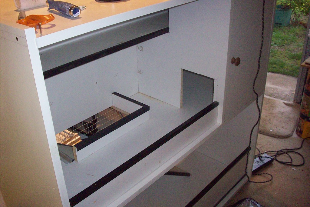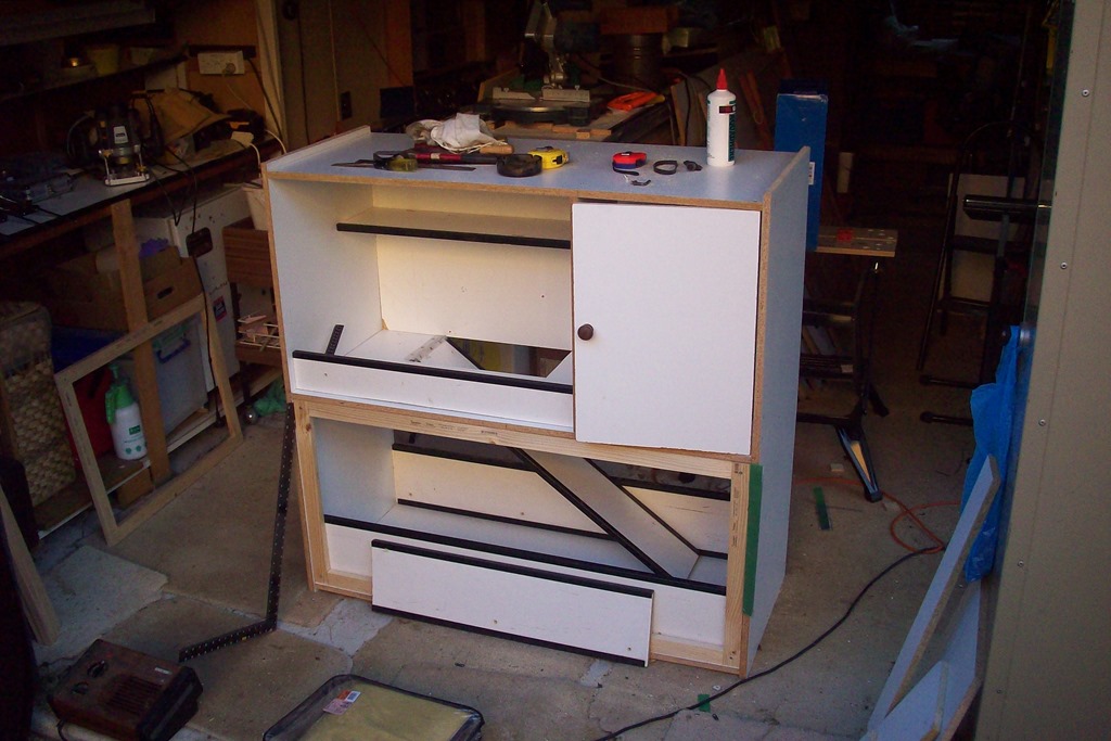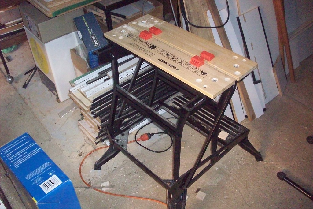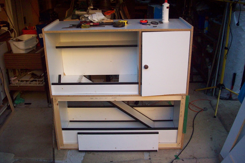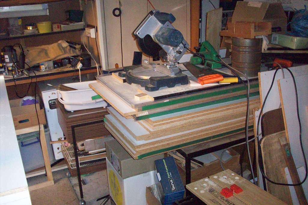 Down to business in the garage workshop. I have a good supply of laminated chipboard from a shop refit so that’s what the hutch will be made of – easy choice.