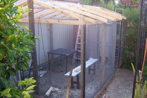 I screwed pine poles to the existing pickets and added a some additional poles. The centre half round poles support the ridge board (eave board from demolished house) and secured with brackets/screws. Roof framing is 100×75 pine and everything was cut with a mitre saw sitting on a BBQ bench seat – LOL. Wire is expensive! a 25M roll of this stuff costs around $225 bucks – ouch. The picture on the right shows some PVC pipe that is the overflow from the rainwater tank.