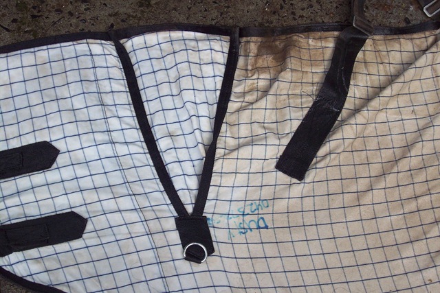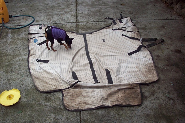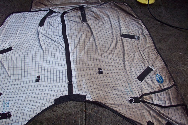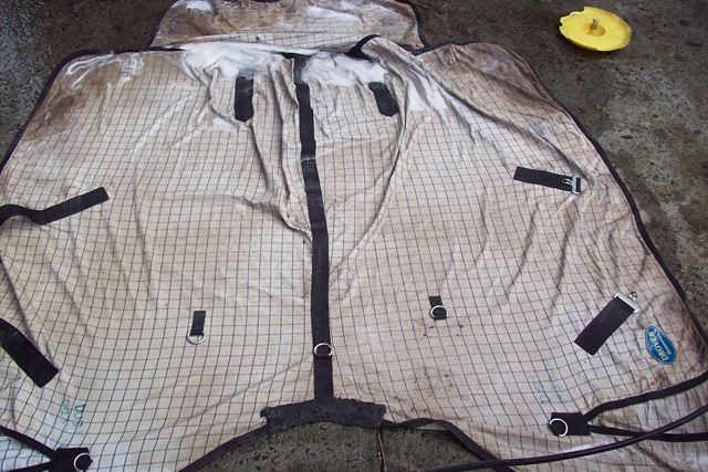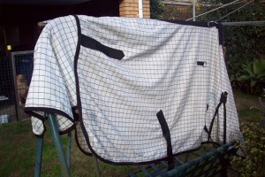 Now that it’s winter horse rugs start appearing on the front porch, they are left there for my attention – to clean.