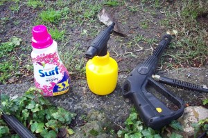 The usual setup: pour some laundry liquid soap into the detergent dispenser and top up with water. Attach dispenser to the gun and soap up the rug, switch to lance and slowly work across and down. But we have a problem, the motor ran for a few seconds and stopped! Took some time to work out that the detergent nozzle was blocked? so we had to carry on without it. The dispenser is handy so I need to try and unblock the nozzle. |