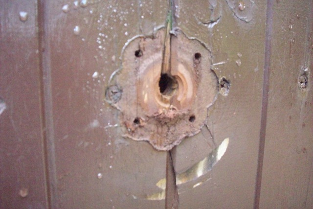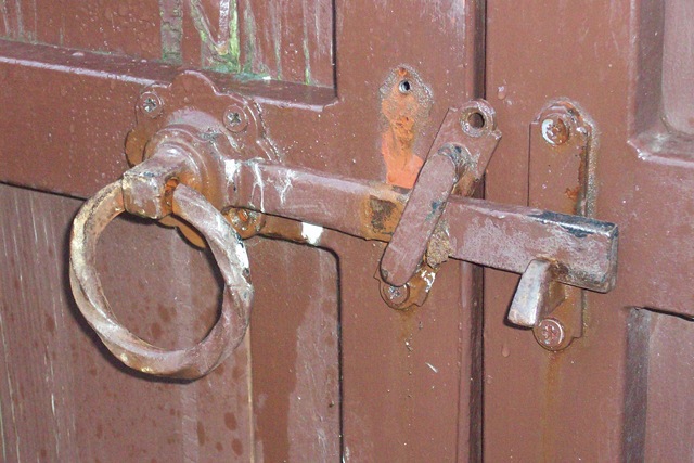 The latch is 35 years old and well worn, the corners of square bar connecting the inside and outside rings have rounded off – round peg in a square hole.