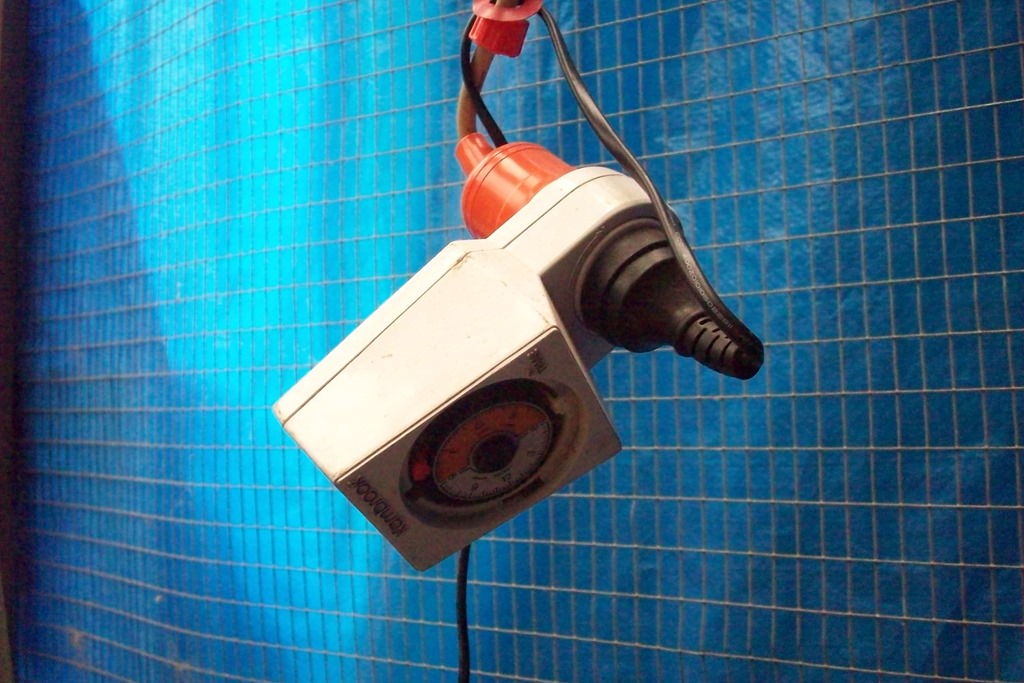 I use a simple mechanical timer to turn the heat lamp on about 5:30PM. Currently sunrise is around 7:15 EST so the off time is set for about 6:30AM. This allows the box to start cooling down so they don’t go straight out into the cold morning air.