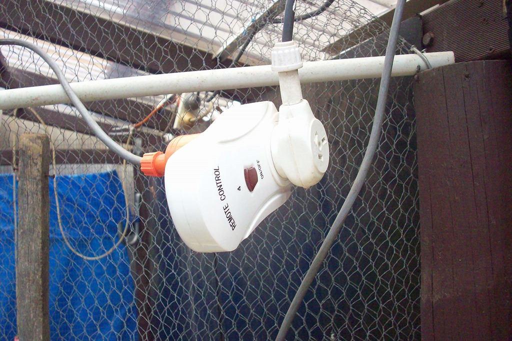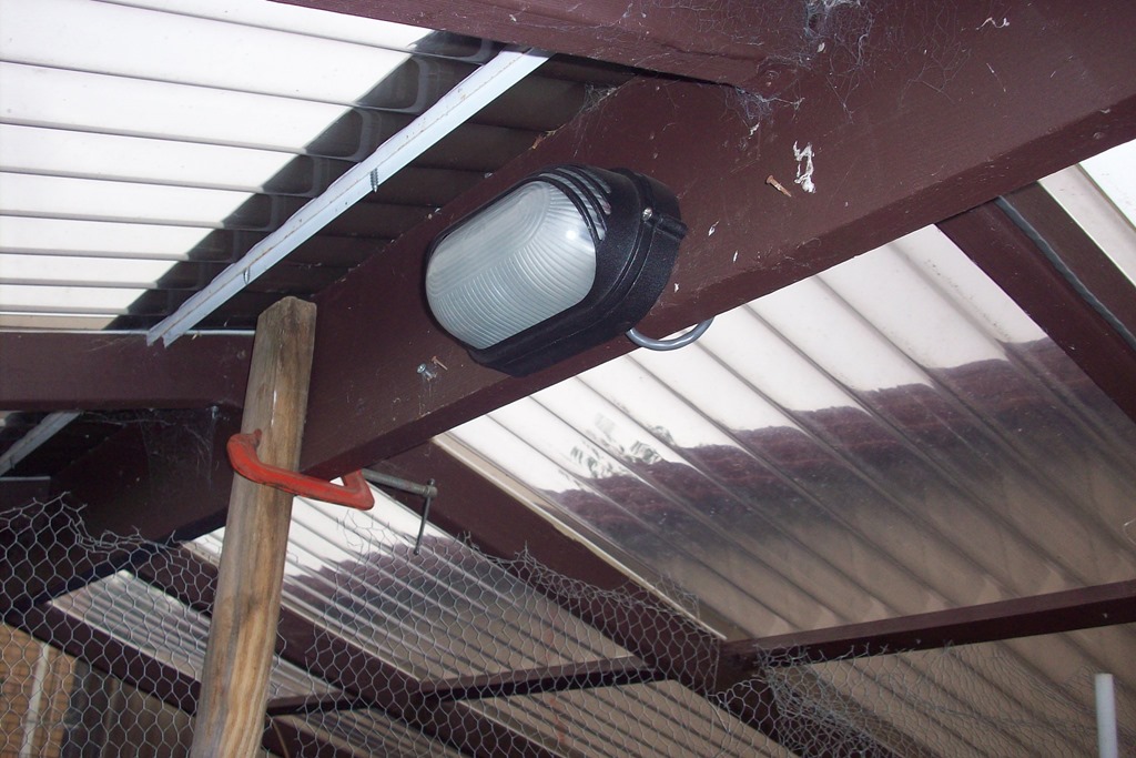 I had been intending to put a light in the run for ages so while I had the tools out decided to install a bunker light on the main centre timber beam., This was another Bunnings clearance item for I think $5 bucks. I go down to the chook run several times each night to check for rat activity so the bunker light is plugged into a wireless receiver so I can turn it on remotely.