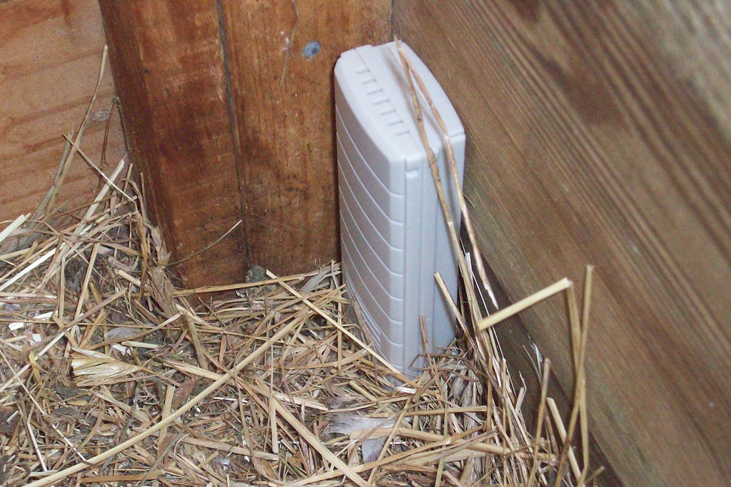 Here is the remote sensor in the back corner of the chooks sleeping quarters. The average internal temp is 4 to 5 degrees above the outside, for example on a chilly night of 6 degrees the box temp will be about 10 – cosy.