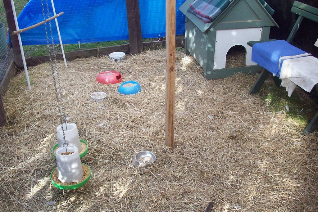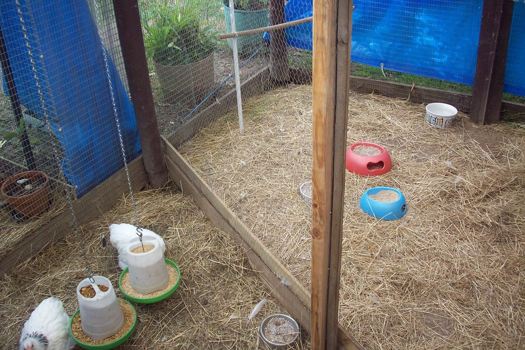 When we came home with the new Pekins (Speckles and Lilly) early in May I partitioned off one end of the main chook run to separate them from the older resident’s – Misty and Ruby (Wyandotte’s).