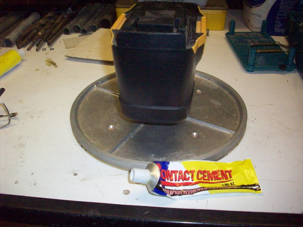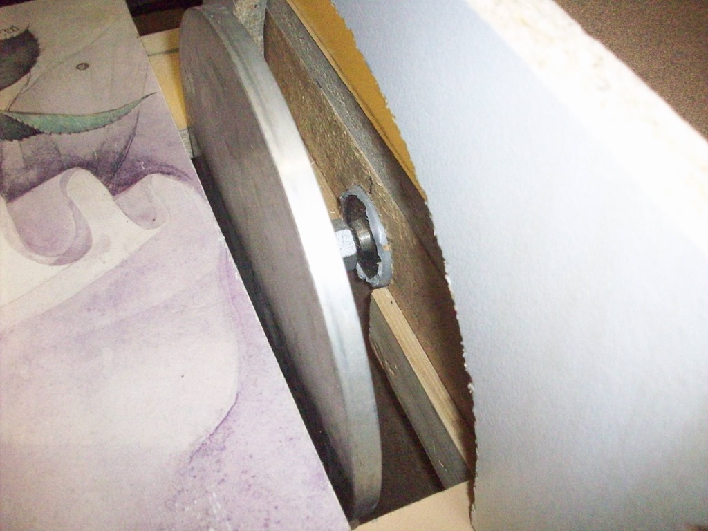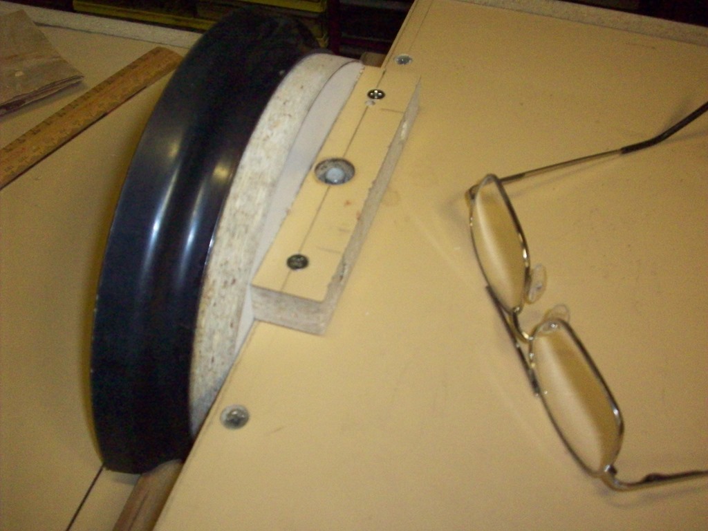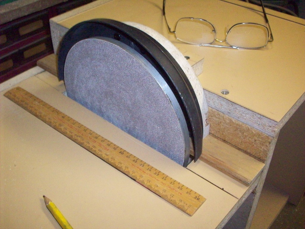 Nearly there, back in the sixties I can’t remember what dad and I used to glue the sandpaper onto the disc. Never mind this Chinese sticky stuff will be fine with a GMC 24V battery sitting on top.