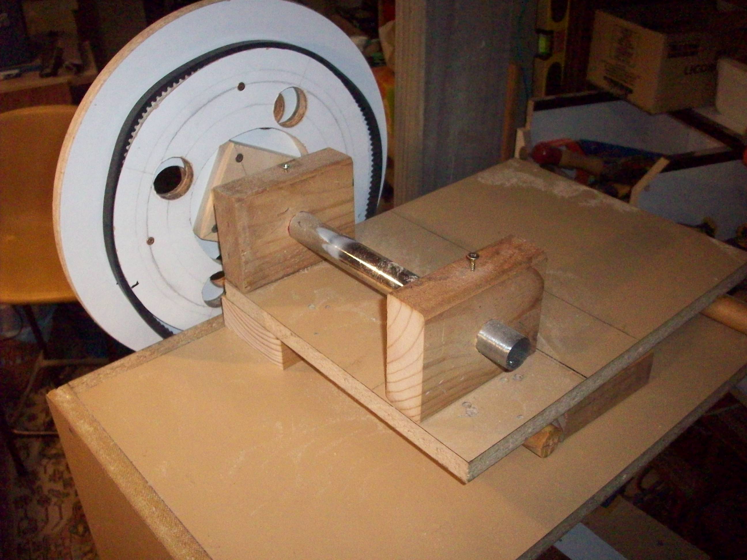 The lower wheel has a drive pulley with a V-grove to accommodate the notched V belt. To cut the grove in the drive pulley I need to some how spin the thing so I made a smaller pulley and cut a V grove in that on the router table with a V grove bit, then attached the temp pulley to the drive pulley so I could spin it up off the motor – crikey. I don’t have any wood turning tools so I hade to make my own to cut the V-groove by grinding down a old file to the correct V profile and then put a cutting edge on it. Once all this prep work was done actually cutting the V-grove was quite straight forward.