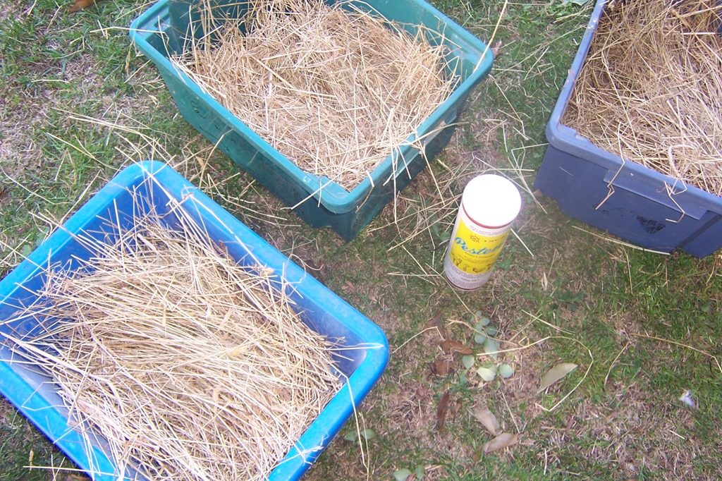 Light dusting before the hay go’s in, if there are bird mites this is where they live, in the bedding and surrounding materials like timber perches etc.
