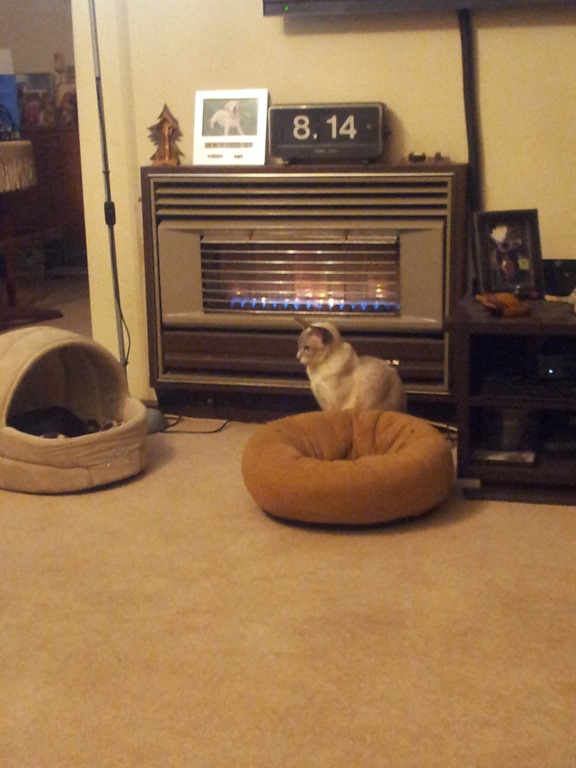 Fired up the old Vulcan space heater in the lounge to keep the animals happy. Milo was there as well but nicked off when I turned on the main lights – scary cat.