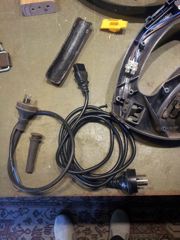 Above: New lead wired in, unit cleaned and working again. When I prised off the handle insert it was inevitable that some of the tabs would break off – they did. I’ll remove the masking tape after the contact adhesive had dried.