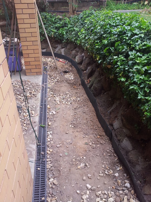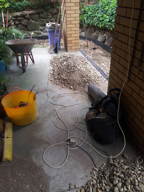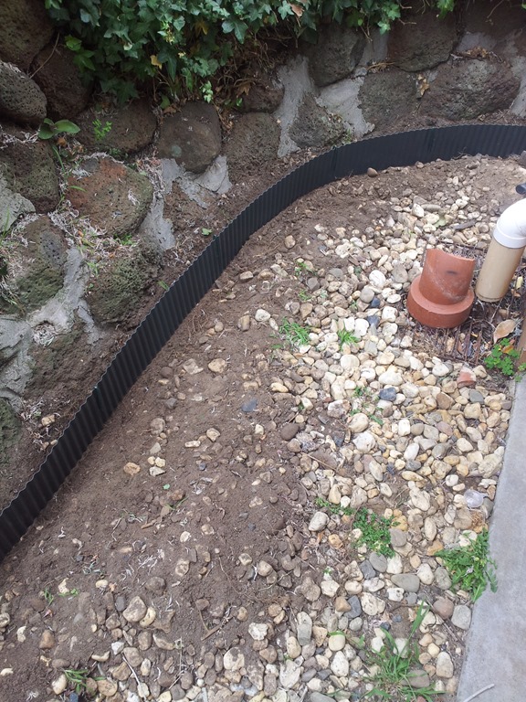 Cooler day to carry on with digging and raking pebbles – must keep going. Got held up with a bit of drain repair but now moving forward again.