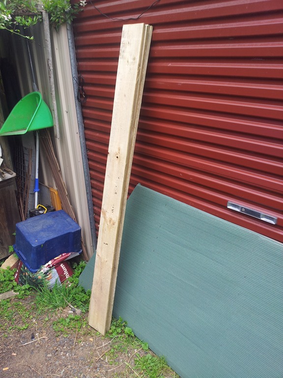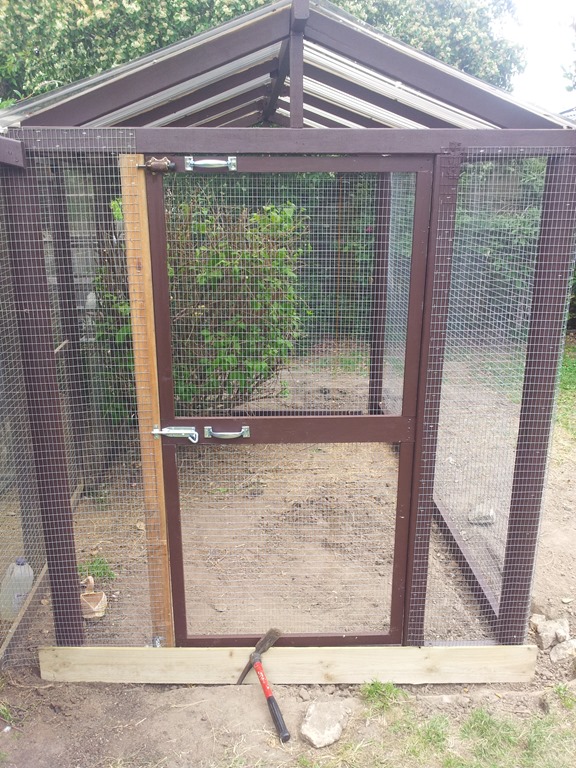 I’m using 150mm fence palings as plinth boards around the base and when I paint those I’ll also do the left jamb. Before I fit the boards I’ll dig out around the base some more and bury all the left over wire as a fox barrier.