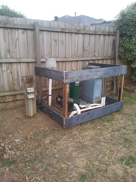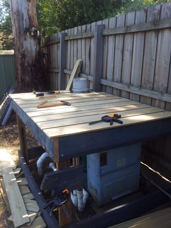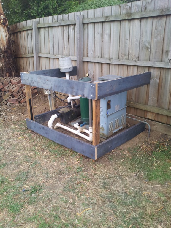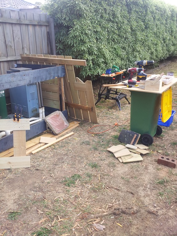 One of my favorite building materials for projects are fence palings. They are cheap and can be used for all sorts of things – I like them. The top is removable for access, later on I’ll do the same for the front. In the right picture you can see the top on it’s side, two bits of pine hole it all together and the spacing is the same as the front gates. That funny cutout is to accommodate the funny round thing in the back left corner.