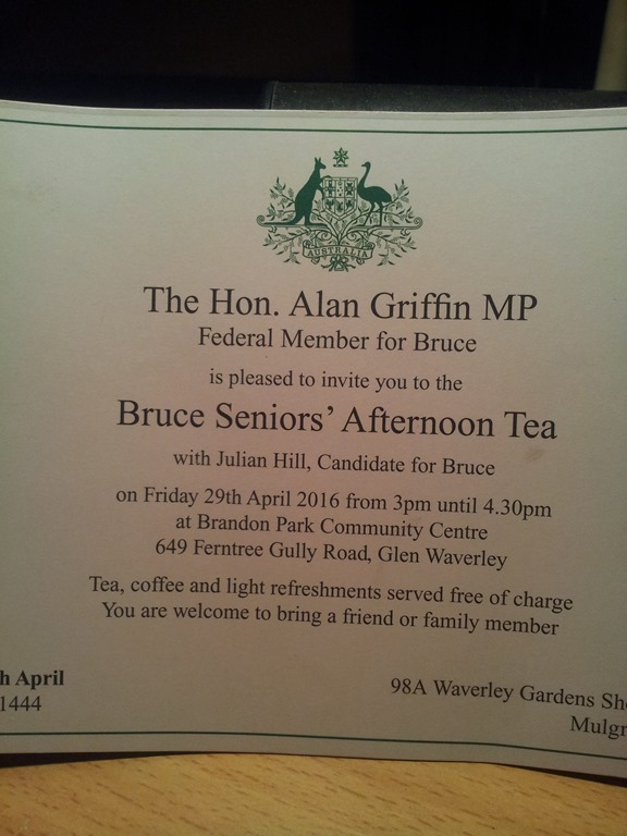 Got a invite from our outgoing Bruce member to attend a Seniors’ Afternoon Tea at the Brandon Park Community Centre – to meet the new guy. Well…never got to meet the old one because he spent to much time down the other end, but we did meet the new guy – a bit of a dud. Anyway…had some nice egg sandwiches with a coffee.