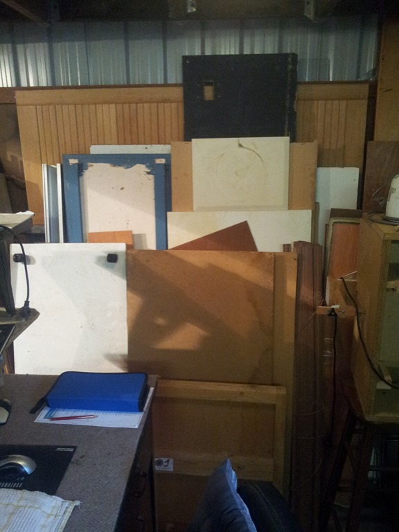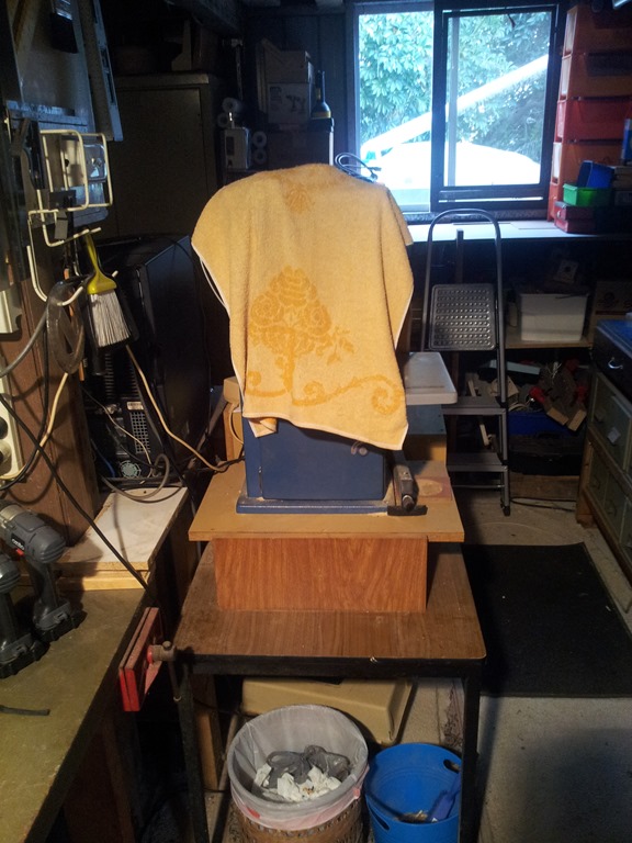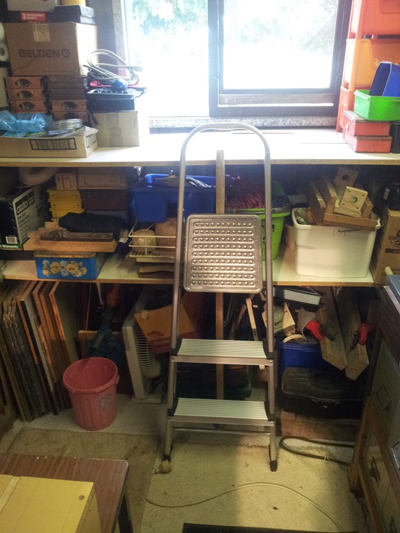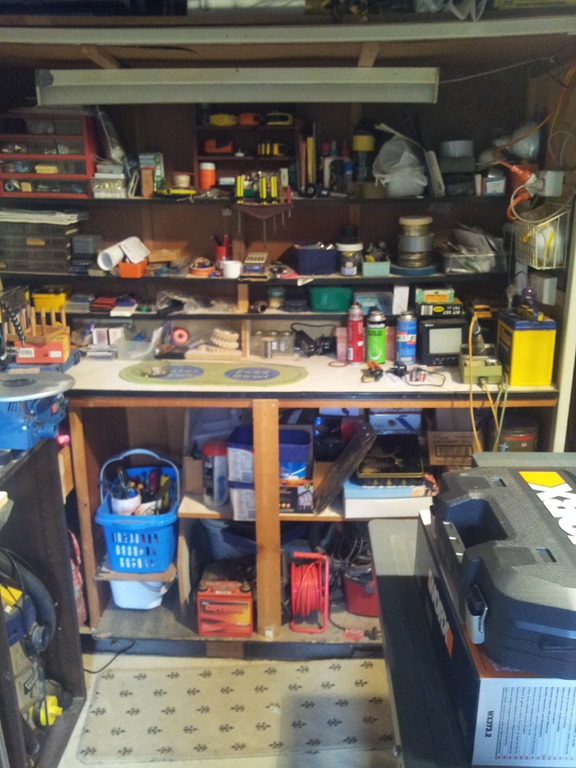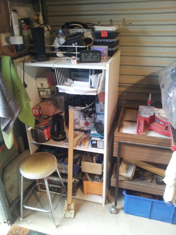 In front of the back windows is more shelf storage and to the left cupboards full of automotive, electronics, electrical and other stuff. Plonked on a stool is my jigsaw table – waiting for a home.