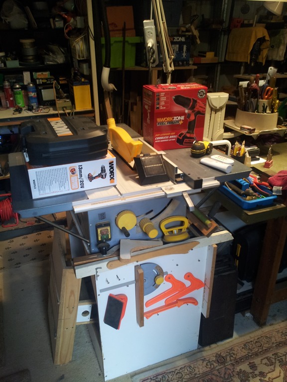 Besides all the issues above I’ve had to locate my main workbench in the centre area (which I would like clear) because I have a pile of 2.4M long laminated chipboard material down the middle on the floor, so I just put the bench over that. The pile sticks out past the bench so I had to make up a ‘special’ stand for the table saw, which like the bench sits over the stuff – crikey.