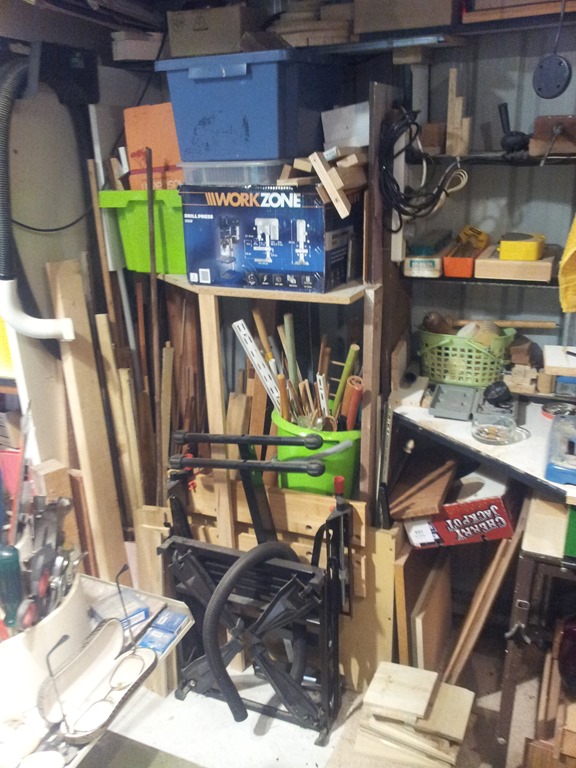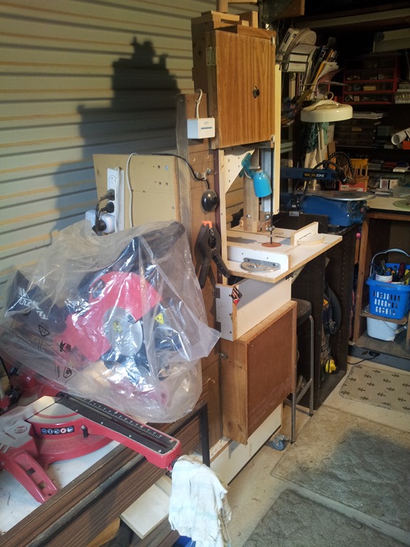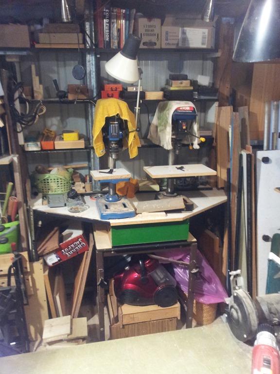 The 7 x 3.5 metre garage provides a nice workshop area but…I still have a space problem. This is mainly due to the fact that the garage was…well…just a garage with all the usual home and handyman stuff. However over the last decade, and certainly since I retired in 2010, woodworking has moved to the forefront of my hobbies. Therein lies the problem, cupboards full of electrical, electronics and computer stuff taking up floor space and preventing me from expanding my woodworking operations. There’s already a ‘space backlog’ with my router table and jigsaw table stacked in one corner – nowhere to put them. Anyway…winter is a good time for planning and that’s what I’m doing so hopefully by spring I’ll have somewhere to move all the secondary hobby stuff to – another shed?