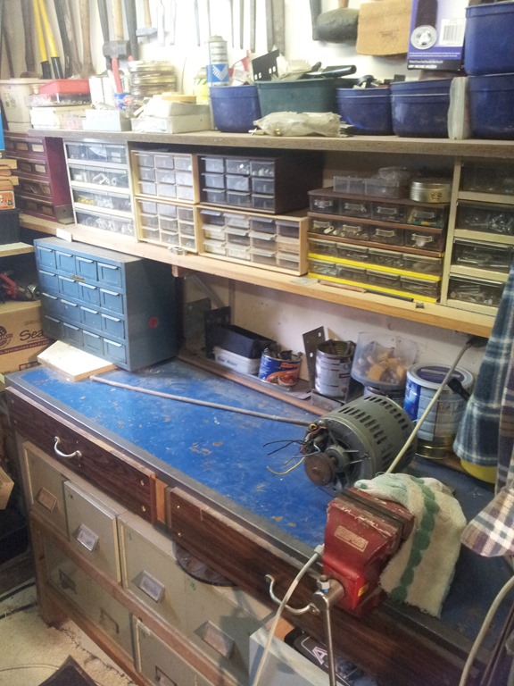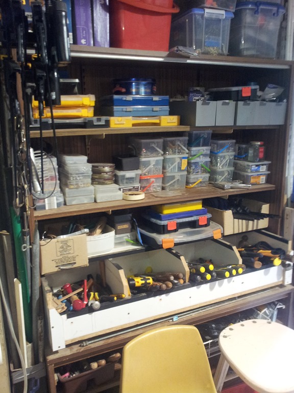 To the left of the tool cupboard is another bench with bulk hardware below, shelf storage and wall hanging tools.