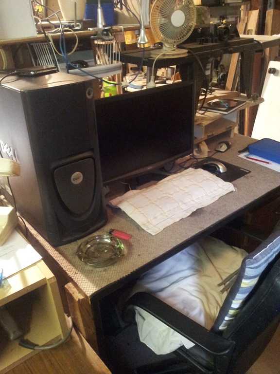 PC and monitor. Once again there is stuff here with no home, a router table and drum sander.