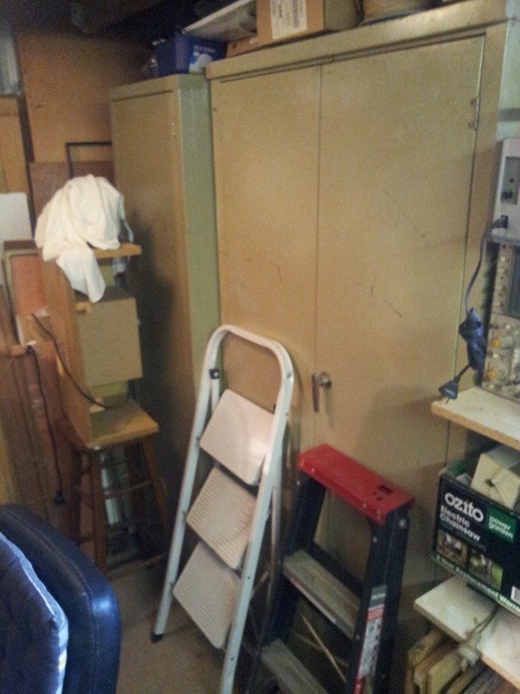 some general storage near the side door. That white cabinet was a entertainment unit that I built to house a CRT TV (remember them) and home theatre system.