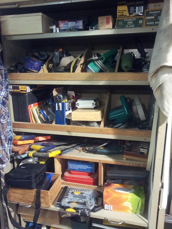 Moving anticlockwise on the left of the bookcase is the tool cupboard – it’s overloaded.