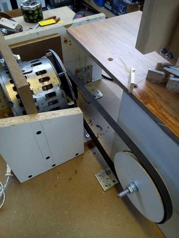 Rigged up a motor mount box that can move front to back to line up the pulleys and the motor can pivot on the top mounting bracket for adjusting belt tension.