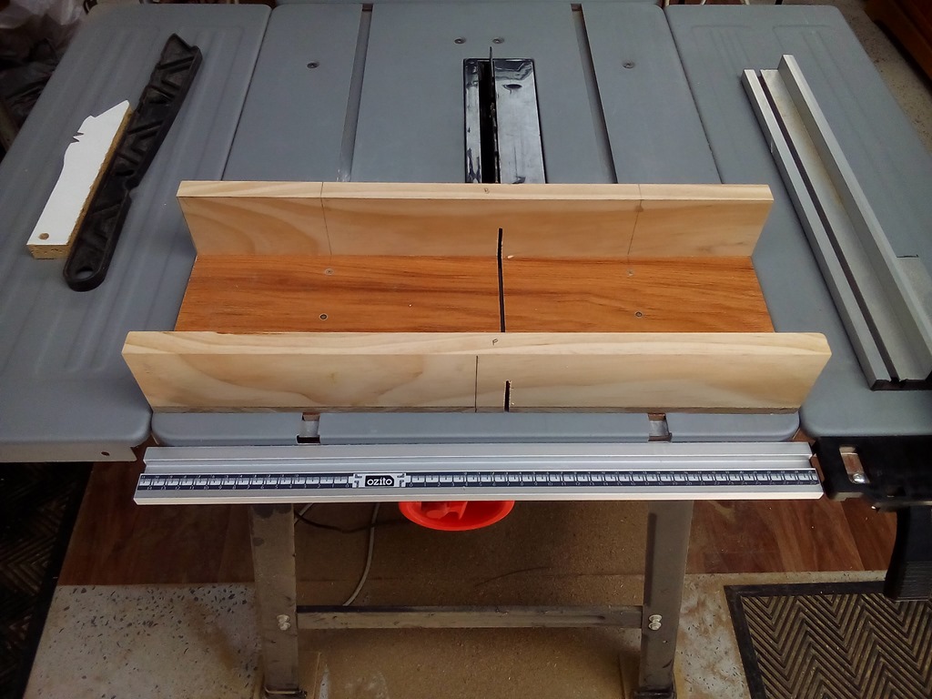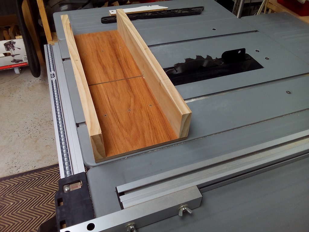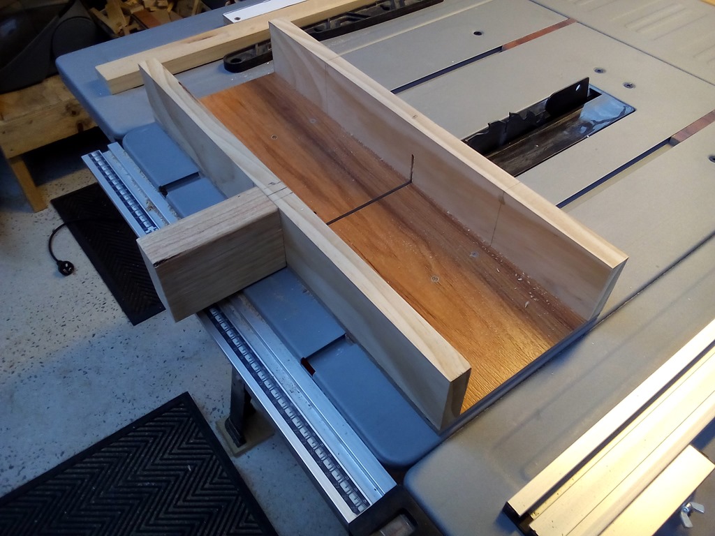 During construction of the bandsaw (and other stuff around the workshop) I had need to cut small parts, to small and to dangerous for the big 12″ sliding mitre saw, so I just made a small crosscut sled for the table saw.