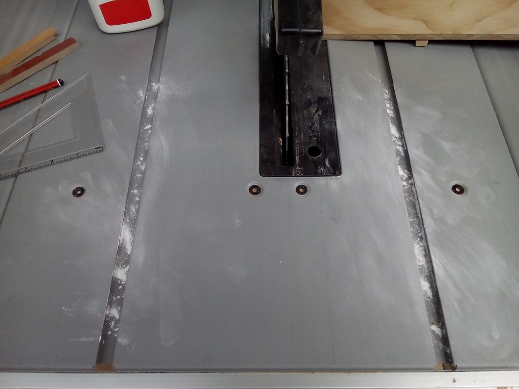Found a bit of pine for the blade guard and note the two laminate strips at the end of the tracks to limit forward travel.