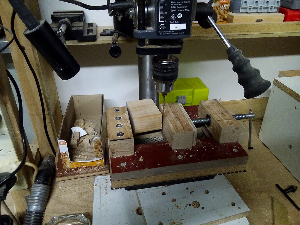 Homemade timber drill press vice, in the background on the shelf (top left) is your usual engineers vice.