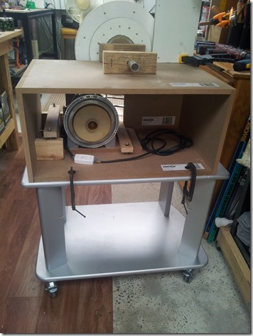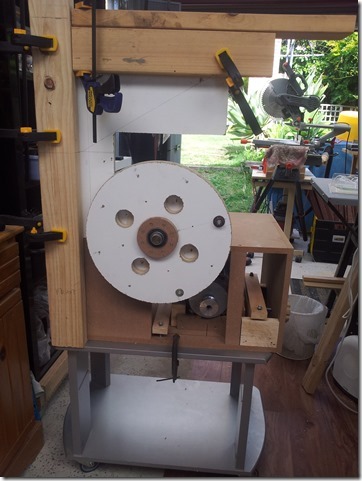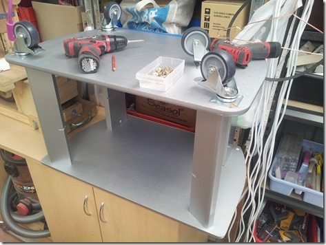 Found the low table in the downstairs rumpus room that I used for the first bandsaw but, also came across this TV stand. Replaced the feet with a ALDI castor set, one pair lockable.