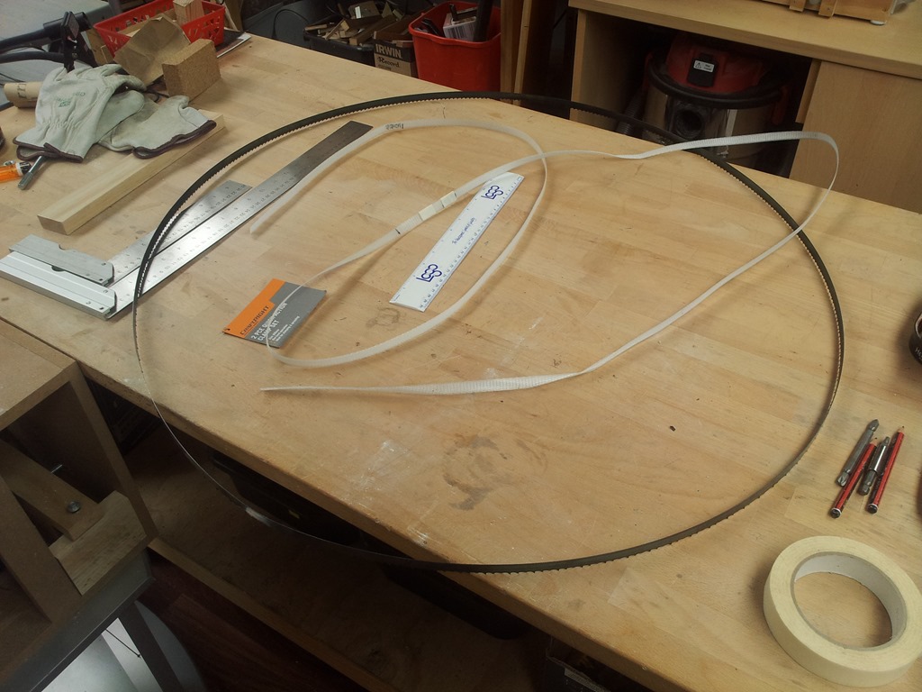 To measure the centres the blade needs to be mounted on the wheels, don’t want to fiddle with something that has very sharp teeth so as before I’ll use banding tape in place of the blade.