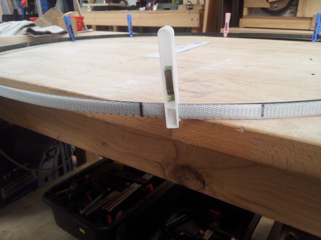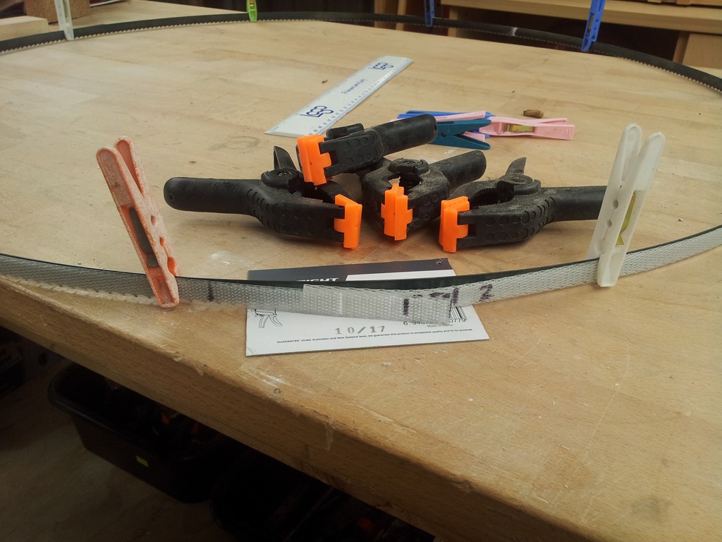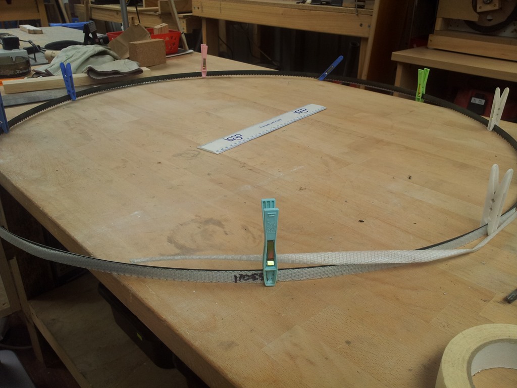 Slightly tensioned the tape, marked the ends and cut off the excess. Then wrapped the join with masking tape. Put the tape on the wheel and when I took up the slack it came apart – need a stronger joint.