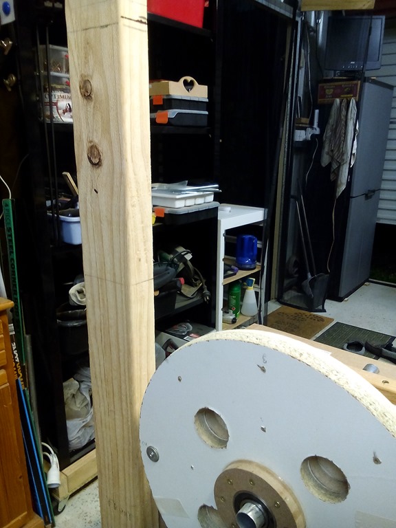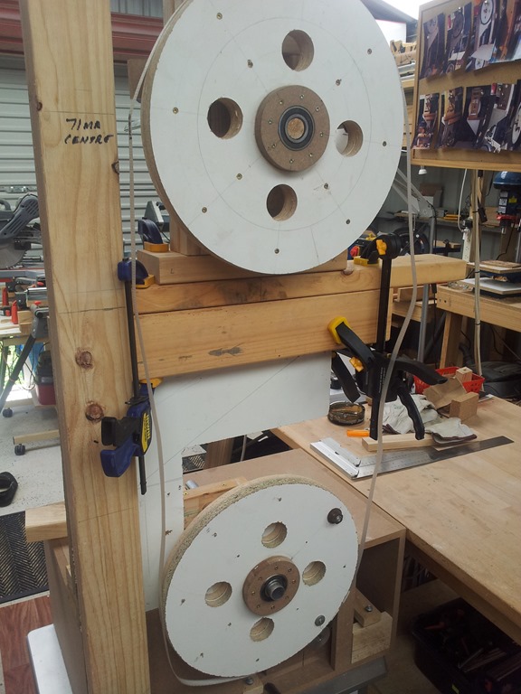 I need to know exactly where to locate the top edge of the upper wheel assembly horizontal support arm and mark that off on the vertical support. For that we need to measure the distance between the shaft or bearing centres plus allow for thickness of the tyres and then subtract from that figure enough slack clearance to allow the blade to slip onto the wheels.