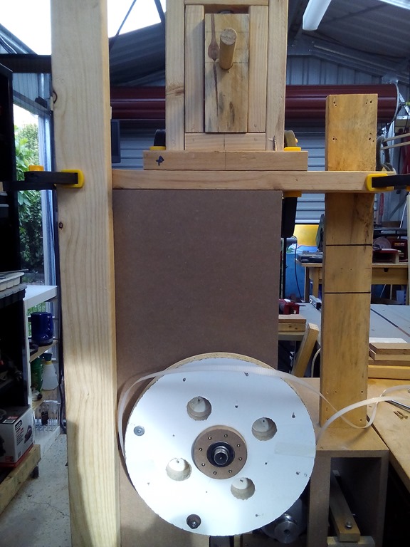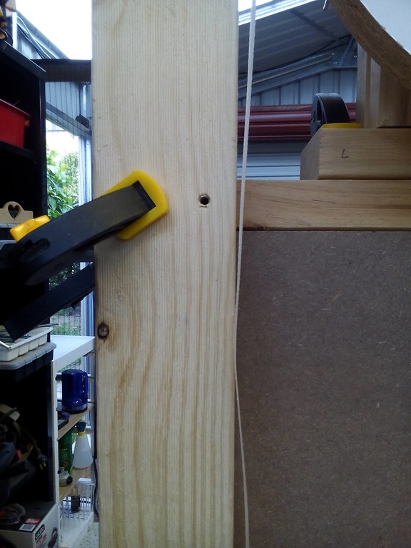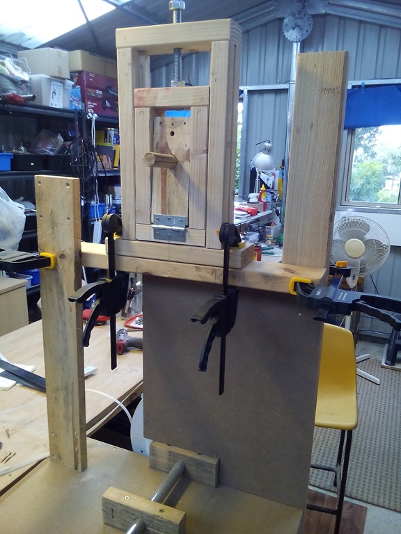 Bought a pile of MDF shelving real cheap from Masters when they were closing down. Cut one to the correct height and clamped it to the vertical post to keep things square. It will remain there through the build and later on have it’s ‘throat’ cut out to provide a clear space for the table through to the upper blade guides – specified as a 14” with riser saw.
