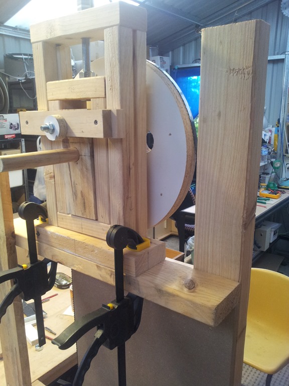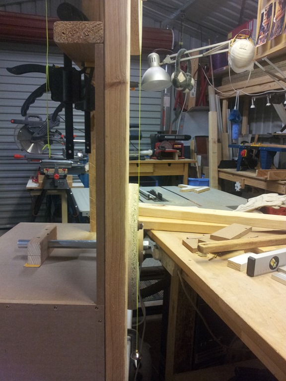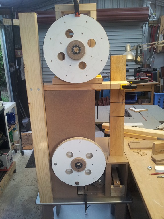 With the upper wheel set to it’s lowest position, wheel block sitting on the bottom of the inner frame, we are making a final check to make sure the real blade (hard to see in the photo) will slip onto the wheels plus…an allowance for the tyre thickness – more on this later.