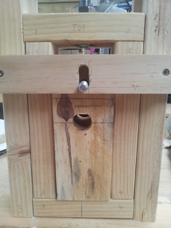 Drilled and reamed a slotted hole for the long coach bolt that come through from the front.