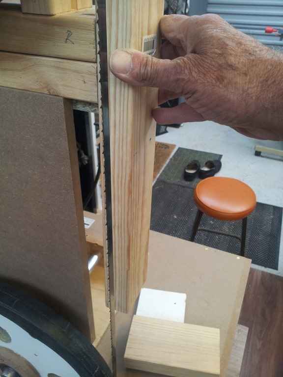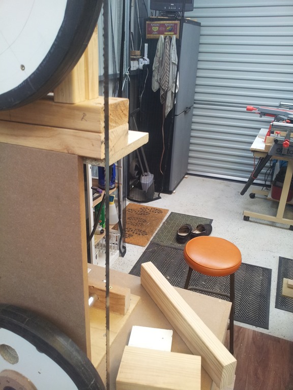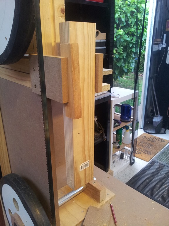 The arm needs to be contained but still be able to slide up and down for height adjustment – and lockable. I’m checking out this idea, the arm is held between two pieces of MDF and the front one has a spacer strip.