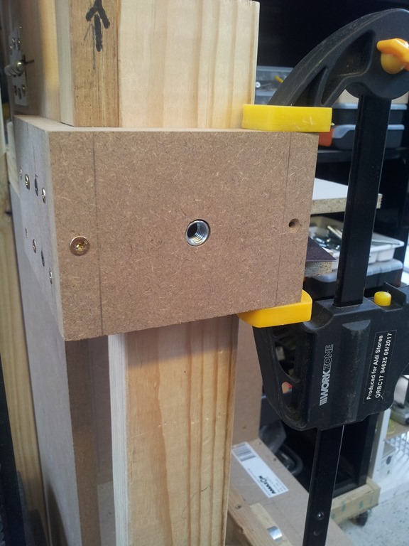 The MDF piece with a T-nut on the inside will screw onto the clamp block. The threaded rod (with adjustment knob) screws in and bites on the arm, locking it at the desired height.