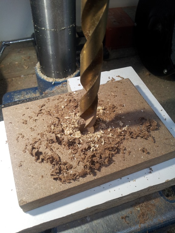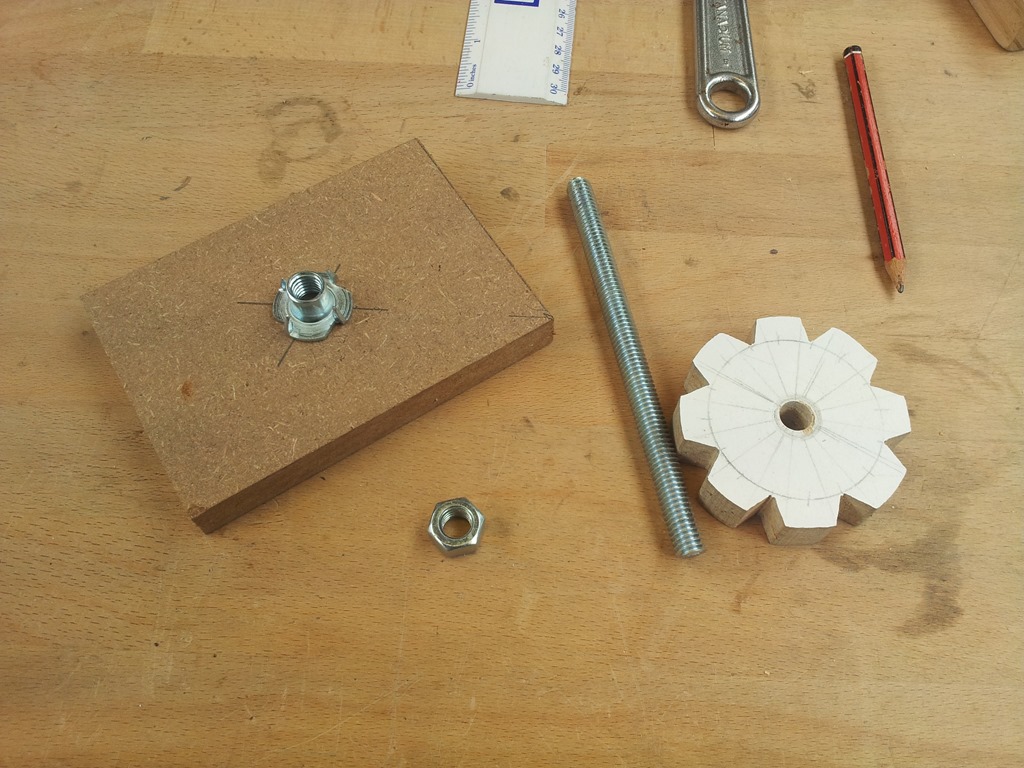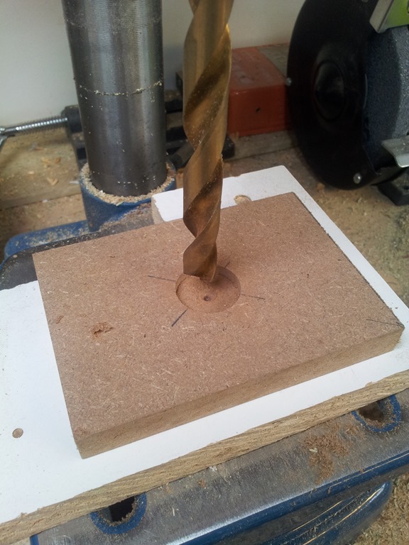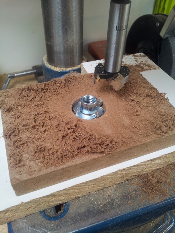 We are using a 3/8” T-nut which needs to be sunk into the MDF block, a 25mm Forstner bit will do nicely.