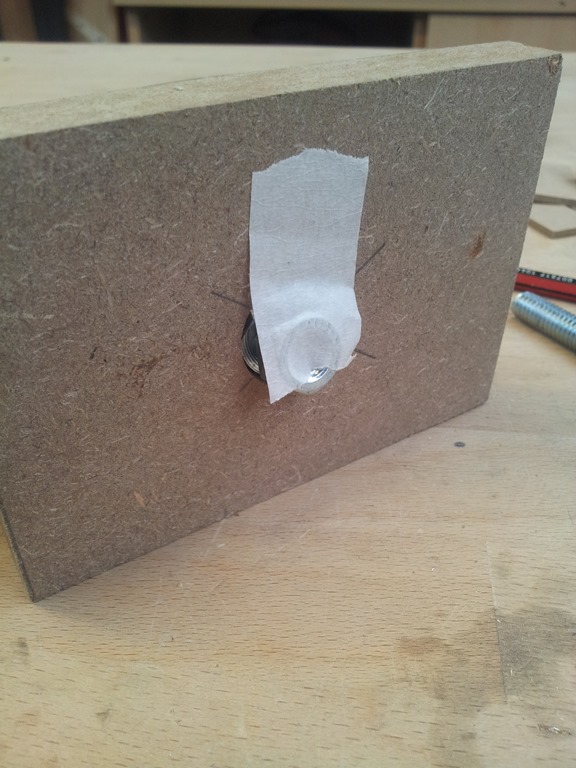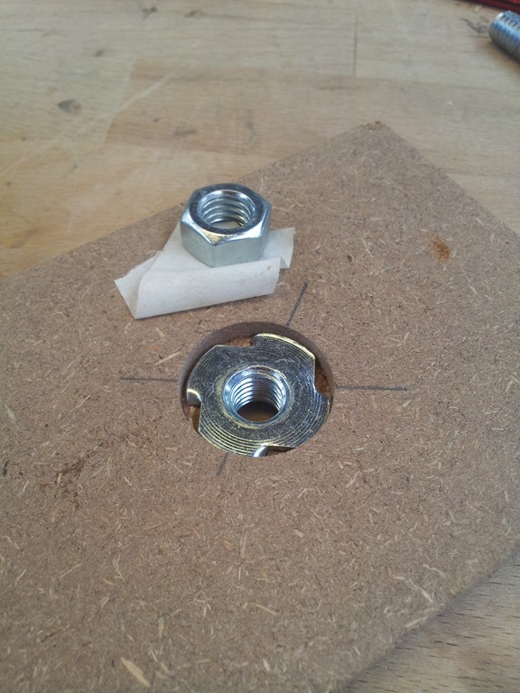 Now over to the vice to press in the T-nut. I want it just just below the surface so a nut held with tape will allow me to drop it into the vice jaws. Pinch up the jaws then apply pressure to fully embed the T-nut (and it’s teeth) into the MDF.