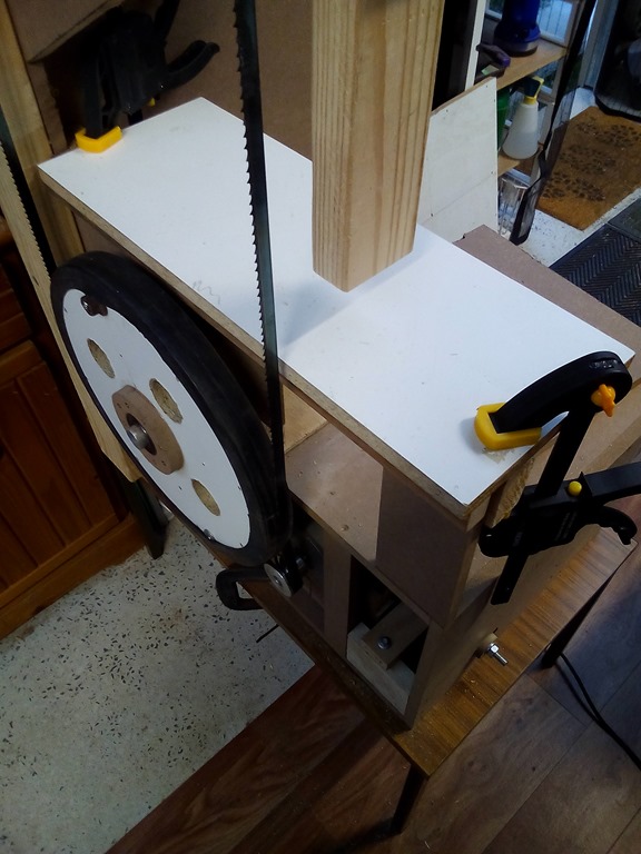 Even with a temporary table I still need to know where the blade position will be so I can make the blade access cut on the table saw. So the first thing is to mount the blade, and make sure tension and alignment are correctly set.