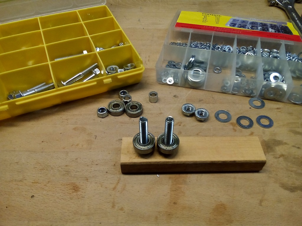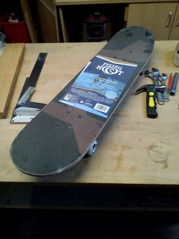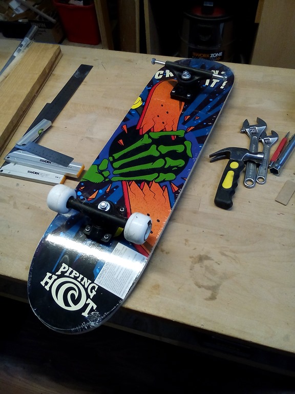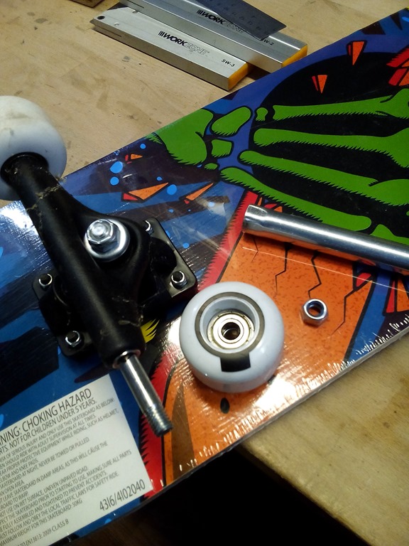 Skateboards are a wonderful source for bearings. They are type 608 (2 per wheel) so you get a set of eight from one board. I usually get the kids ones from Kmart, prices start from $10 but the one above was like $25 for better quality bearings. Looks like I need to get another one, already pinched one end for the 8” bandsaw.