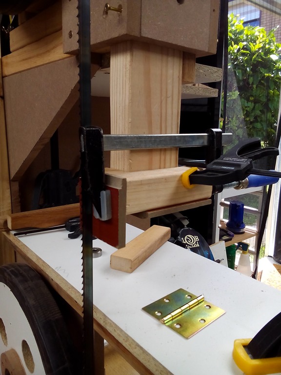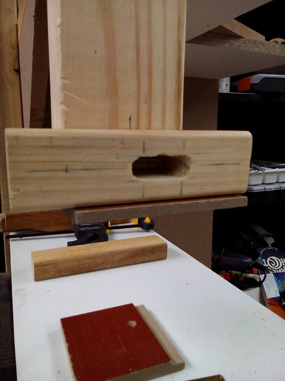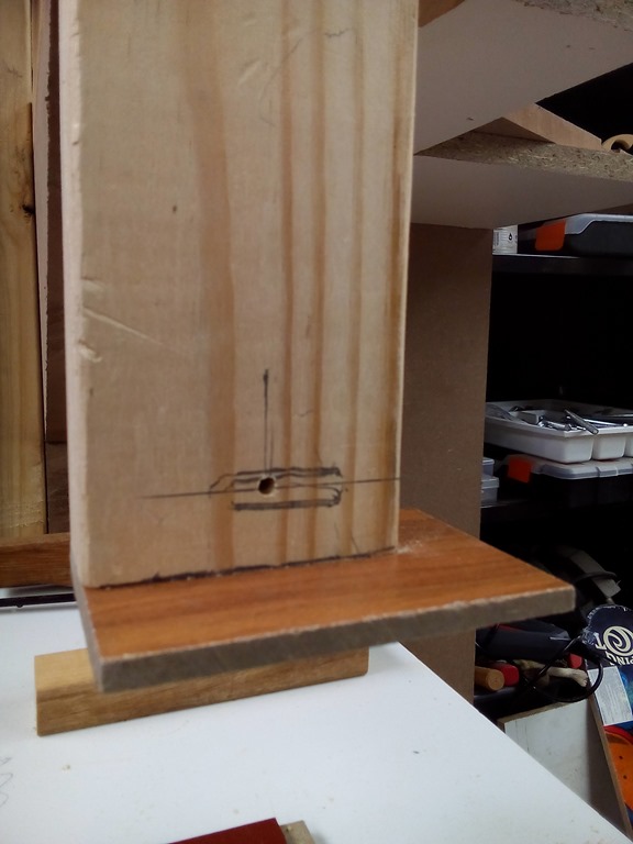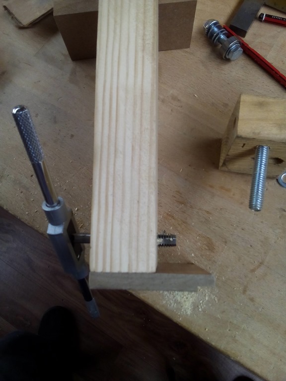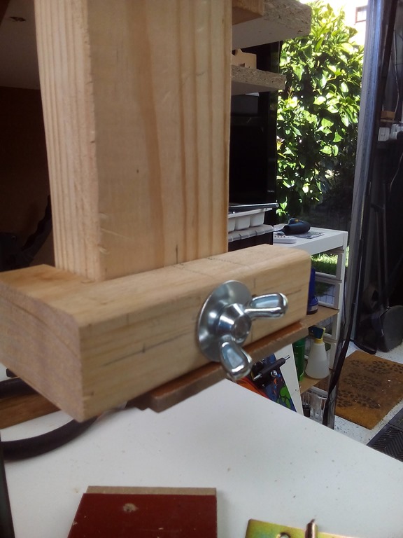 With good thread depth in the 3/8” tapped hole the rod bites nicely, finish with a mudguard washer and 3/8” wing nut. Taking a break now and when I come back will put another bit of timber on top to sandwich the sliding guide block.