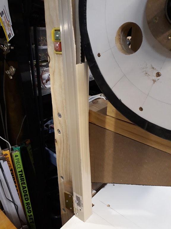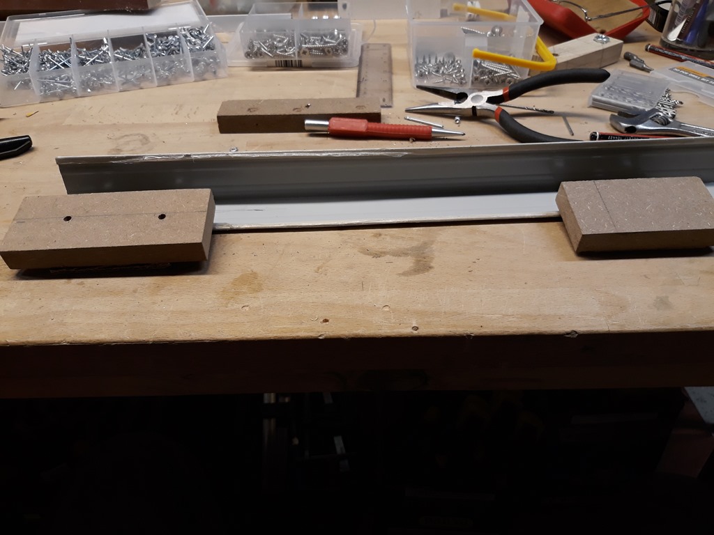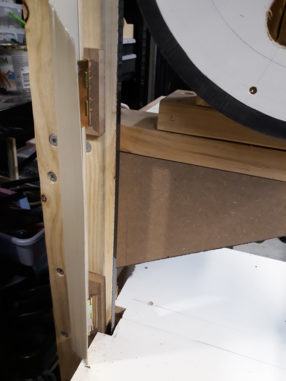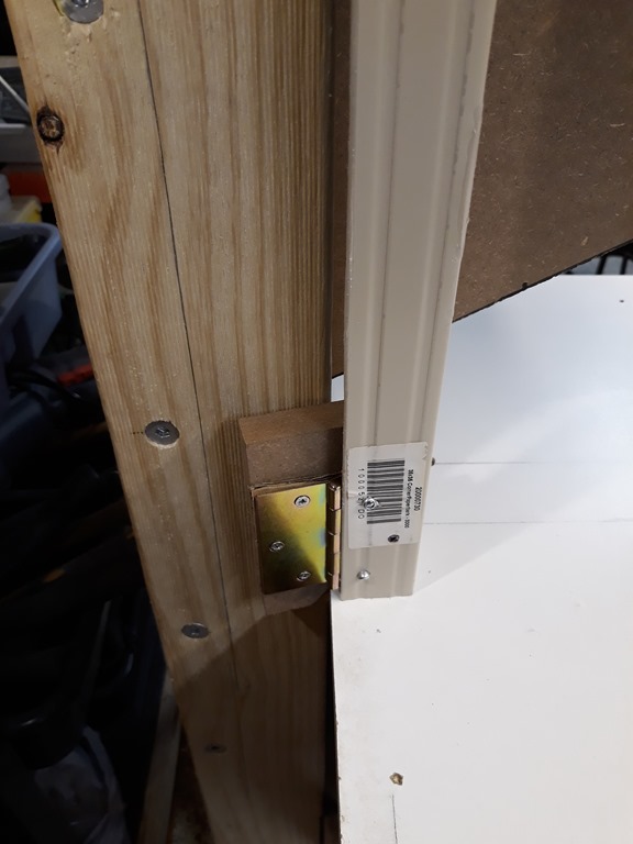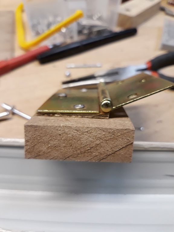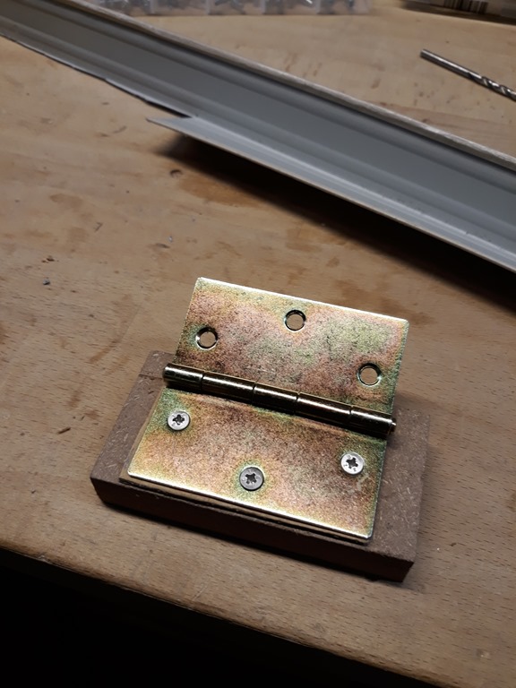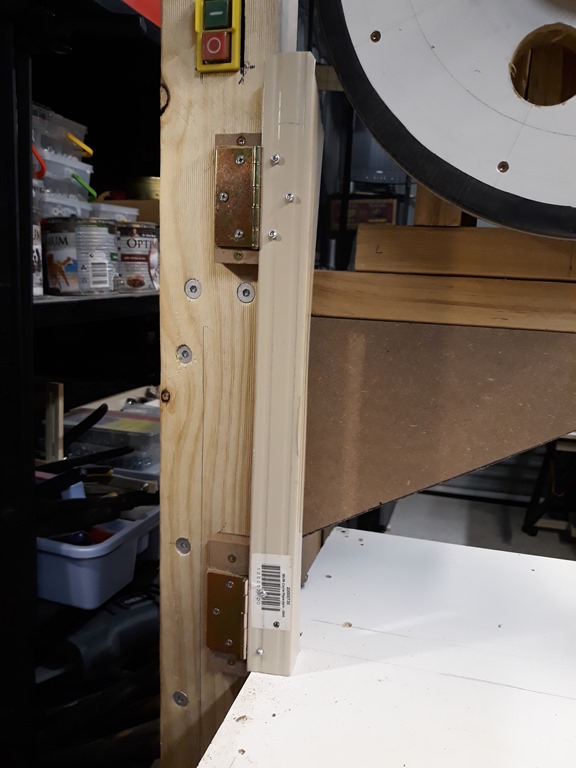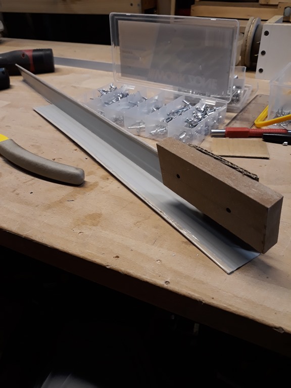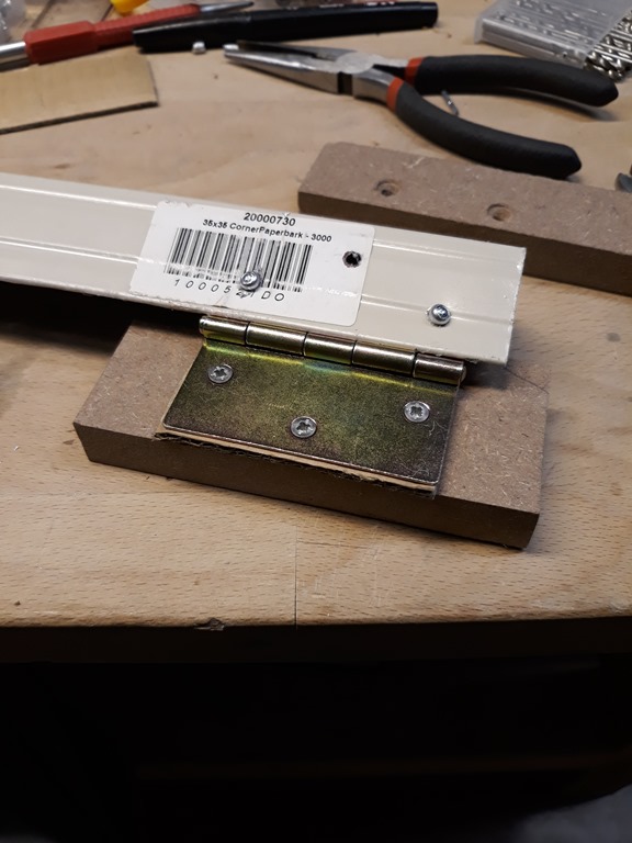For this session we are going to make the left side blade guard. The power switch is close to the blade on that side so it’s a priority to get this done. I’m using a length of Colorbond corner trim left over from the actual garage construction. Screwed one side of a hinge to a bit of MDF and pop riveted on one end of the trim.
