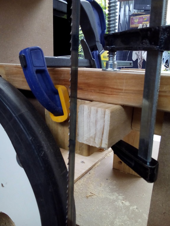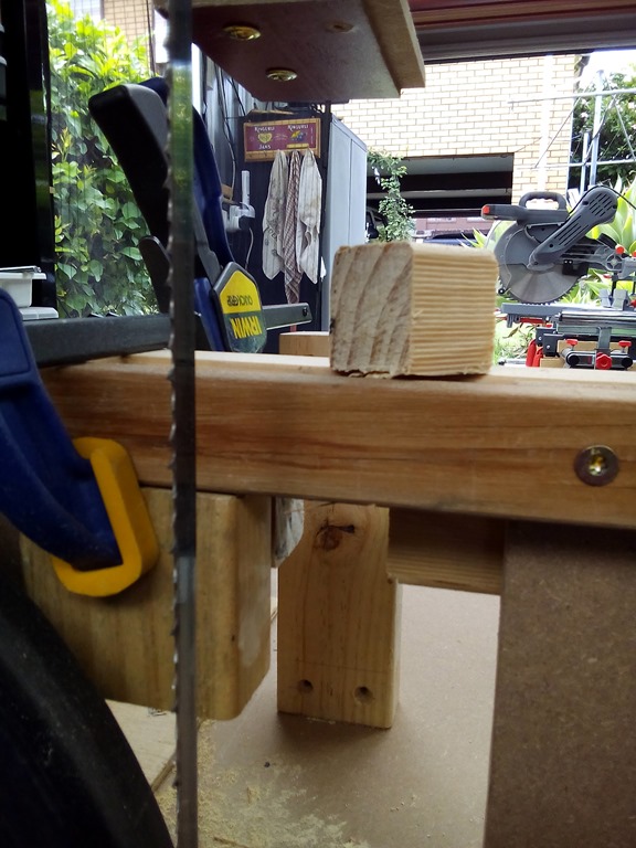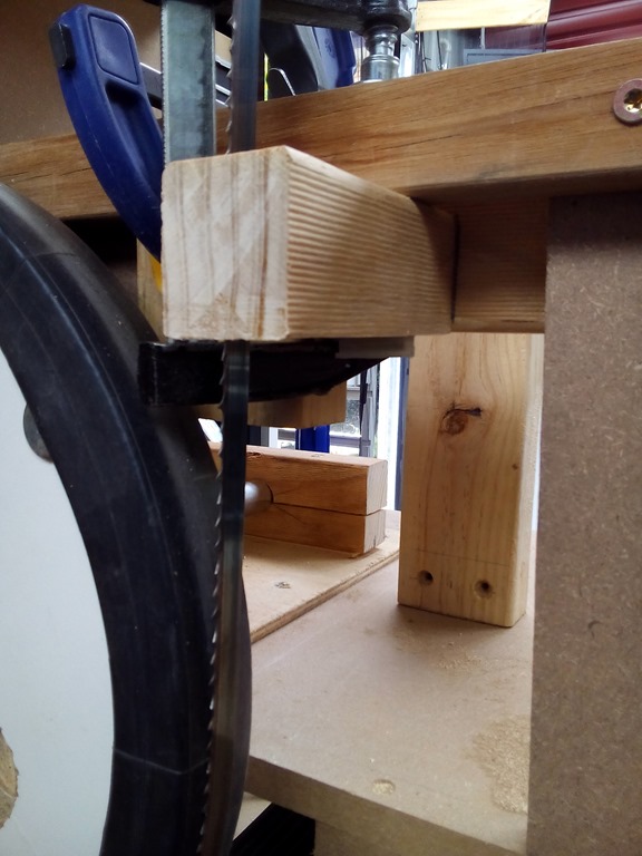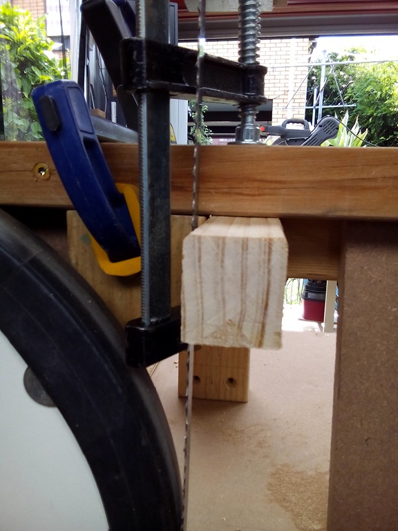 Mocking up with clamps, the left pine block screwed in as is, the right will slide front to back. I need to notch out the table support.