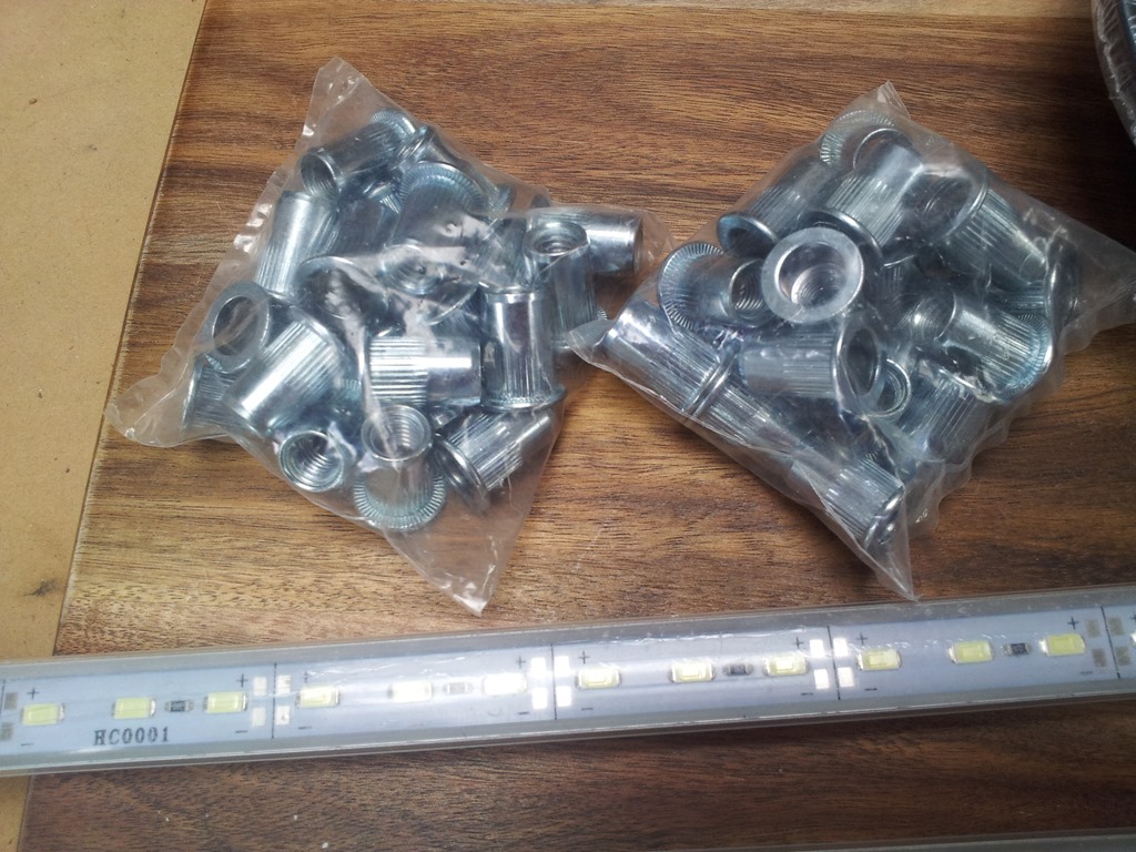 Two LED sticks, threaded inserts, a tap reseater, small baking bowls for workbench hardware and out of picture a long reach locking clamp.