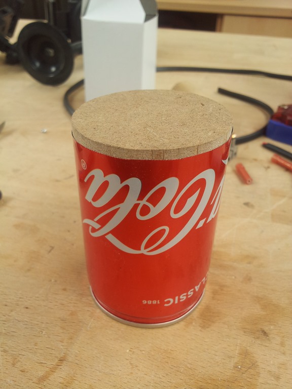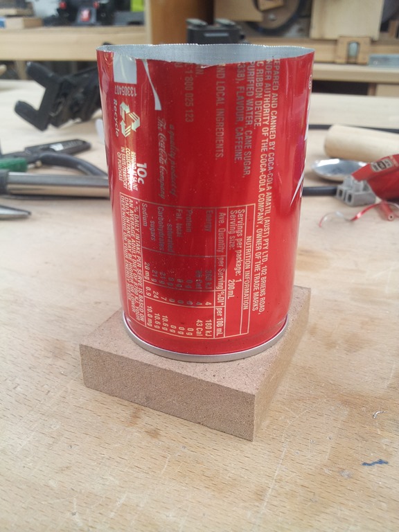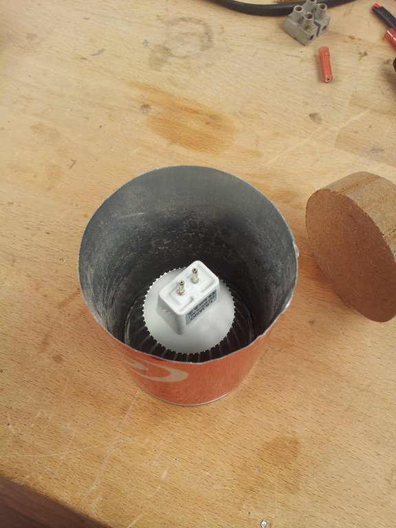 From the previous related post on this with the lamp fitted into the front of the can we can now make the base.