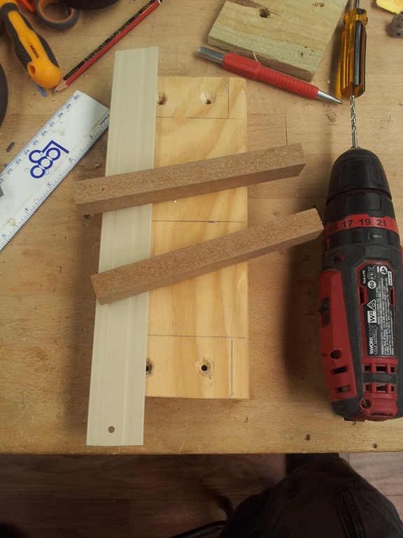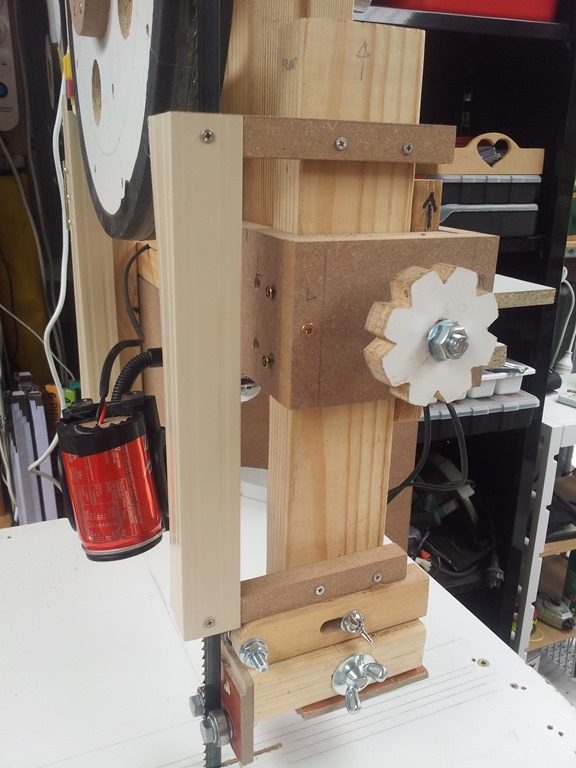 As with the left we’ll use another bit of left over trim from the Colorbond garage construction. I’m planning to use two narrow lengths of MDF to secure the guard to the blade guide arm.