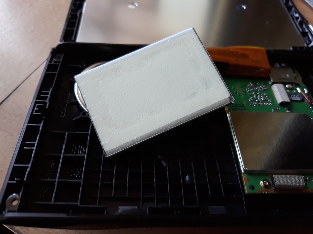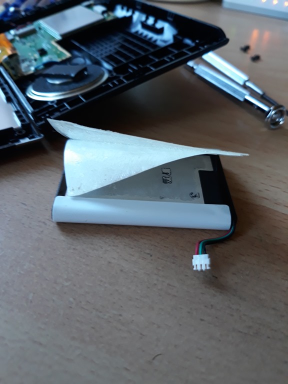 With the sticky pad on pressed the battery back in it’s cavity and plugged in the tiny connector.