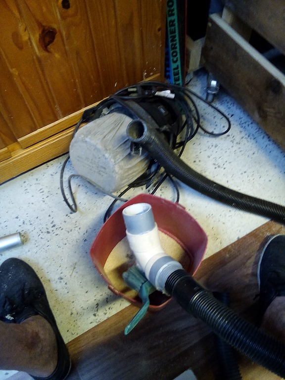 I’ve been using the little Shop-Vac on the 12” mitre saw with a DIY hose with plumbing fitting to mate to the dust port on the saw. Pulled all that off and went looking for the original hose and got the thing hooked up to the saw.